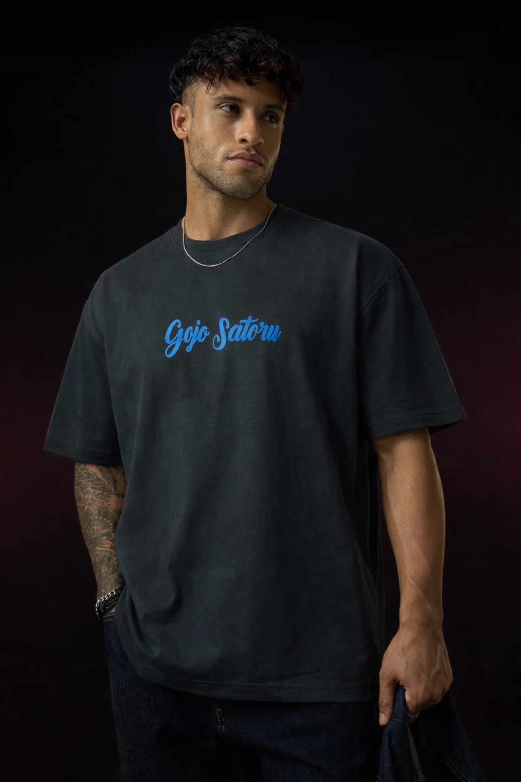 Dual-Sided Design: Clean “Gojo Satoru” cursive branding on the chest with a high-impact character portrait on the back.
