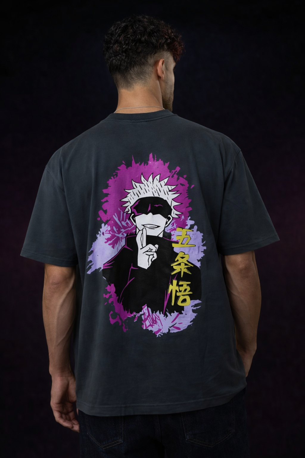 Channel the power of the strongest sorcerer with this Gojo Satoru Premium Oversized T-shirt. Featuring a minimalist signature script on the front and a bold, “Hollow Purple” inspired graphic on the back, this tee is the ultimate statement piece for any Jujutsu Kaisen fan.