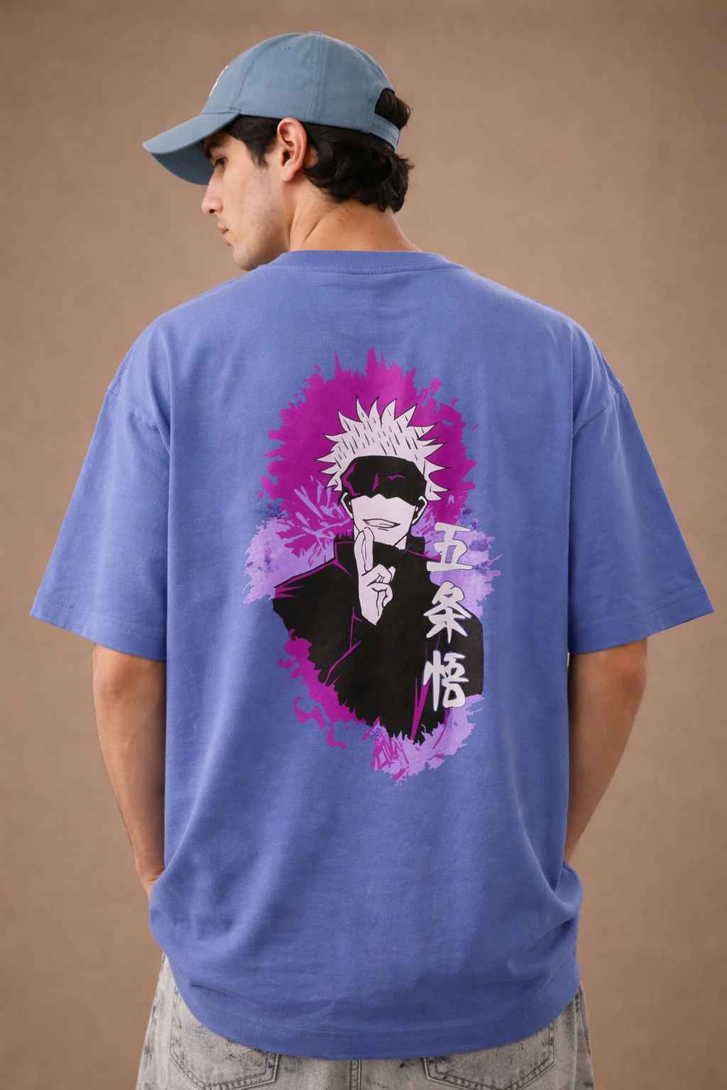 Channel the power of the strongest Jujutsu Sorcerer with our Satoru Gojo Oversized Graphic Tee. This isn’t just a shirt; it’s an expansion of your style. Featuring a sleek, minimalist script on the front and a high-impact, purple-hued splash graphic on the back, this tee captures Gojo’s effortless cool.