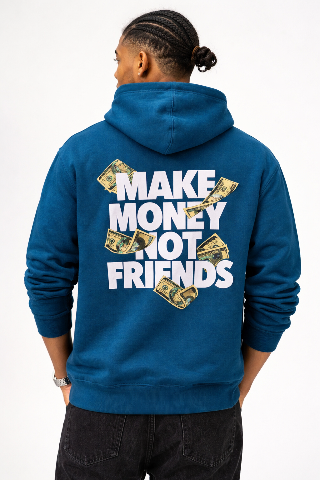 Crafted for those who stay on the grind, this hoodie features the iconic “Make Money Not Friends” slogan in bold, high-contrast typography. The deep teal colorway offers a unique alternative to standard black or grey, while the floating currency graphics add a 3D aesthetic to the streetwear classic.